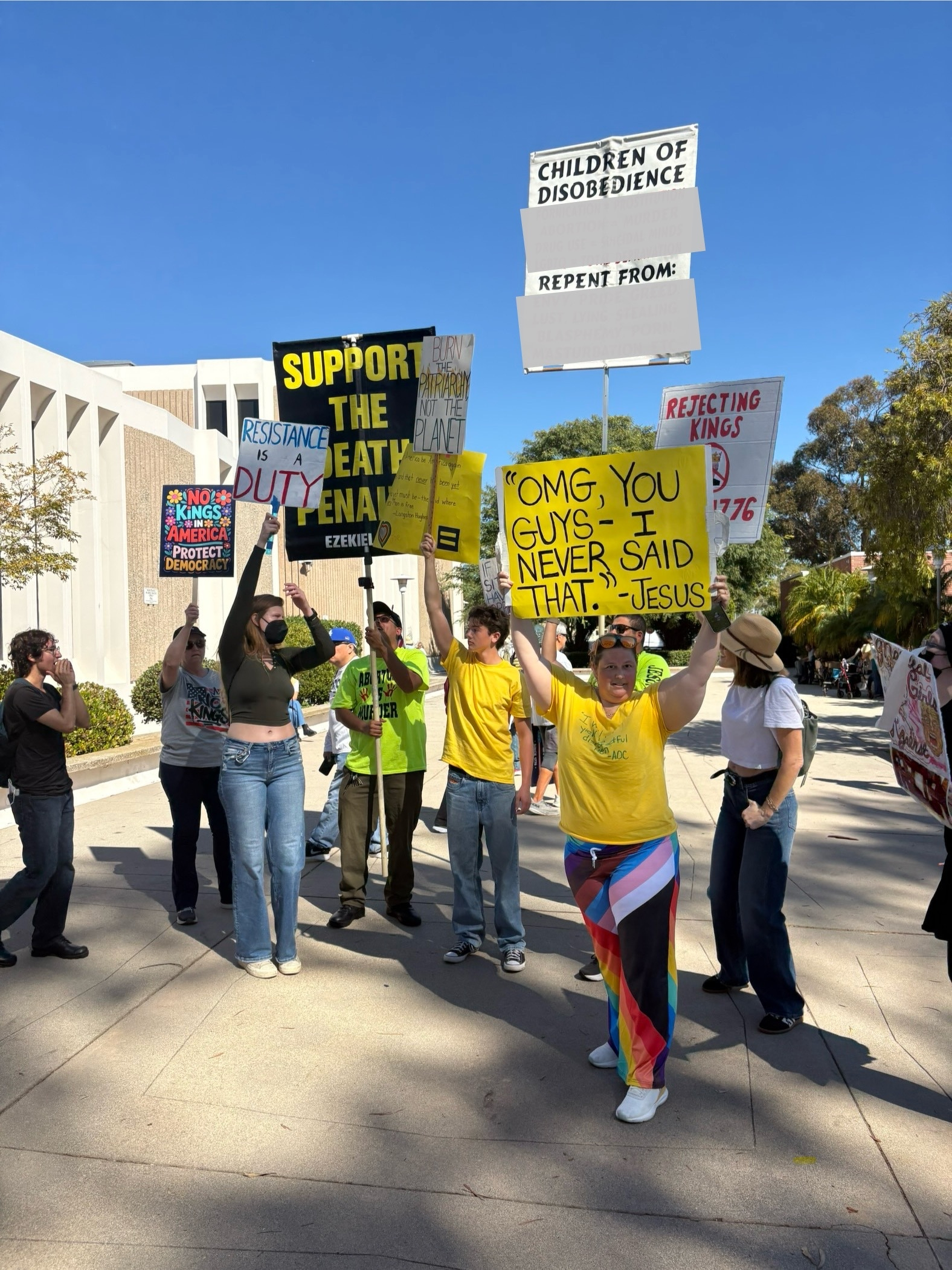 My heart was full of pride and admiration as people followed these men around in order to cover their bigoted signs with their own signs of love, resistance to the wannabe king, and a call to protecting democracy. Seeing a community come together to fight injustice and protect marginalized people stirred emotions of connection. Advocacy can feel lonely sometimes. These No Kings protests may not have any direct effect on stopping the destruction of our democracy, but they do fill up people who have been working in their own ways in their communities. We can leave these protests feeling ready to fight on, to find different ways to resist, and to support those who most need us.